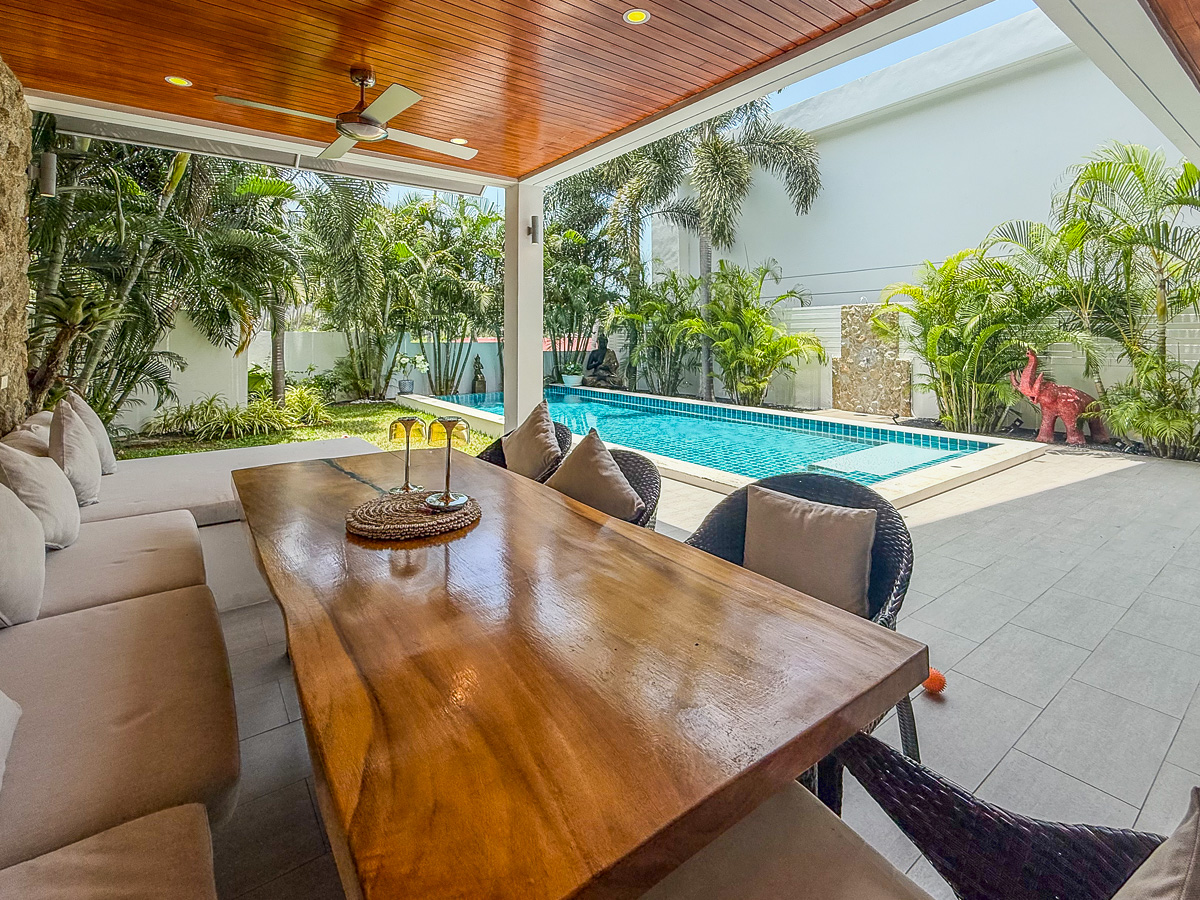 Espace extérieur couvert pour le salon et la salle à manger avec ventilateurs de plafond, situé à côté de la piscine