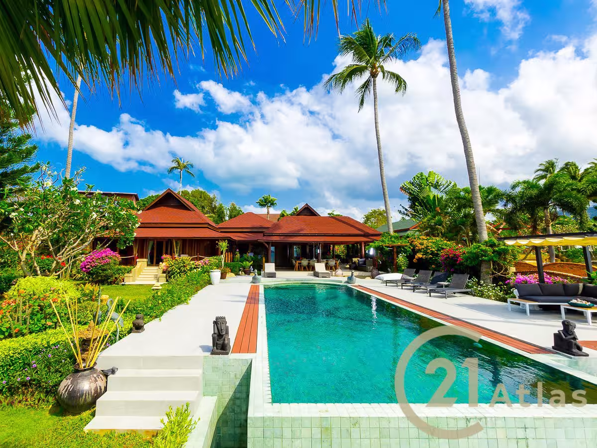 - Cette villa thaïlandaise de luxe en bord de mer avec jardin tropical est située à Taling Ngam à 28 m de la plage – 1.2 km de la route principale – 10.6 km de l’école internationale Greenacre – 13 km du sanctuaire Samui Elephant Kingdom