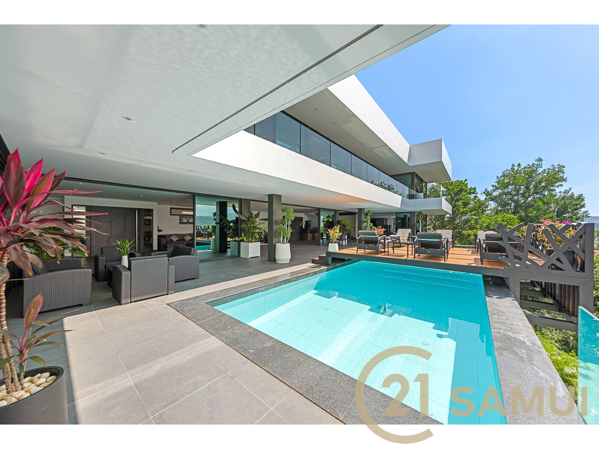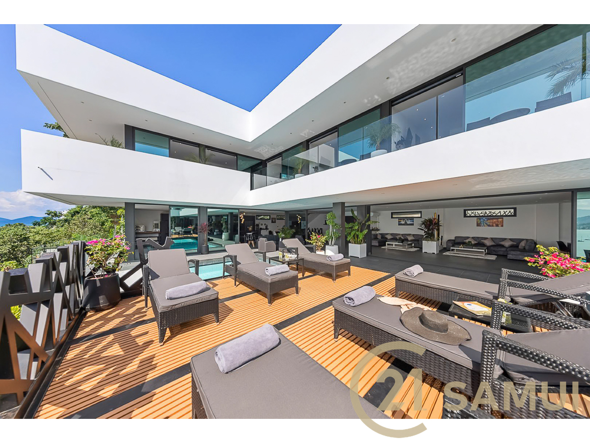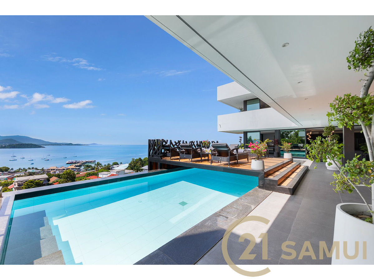 Perchée sur les hauteurs de Koh Samui, cette villa d’exception développe plus de 1,500 m² de surface construite et offre une vue panoramique spectaculaire sur l’océan et la jungle environnante.