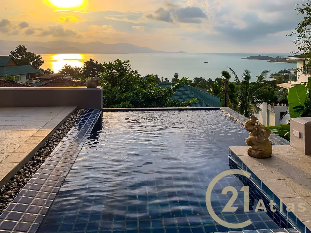 This single story villa is located in a Prime location and has a panoramic view over Big Buddha Bay to Ang thong National Marine Park. You can enjoy yearly the beautiful sunsets.